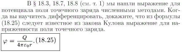 В § 18.3, 18.7, 18.8 (см. т. 1) мы нашли выражение для потенциала поля точечного заряда численными методами. Когда вы научитесь дифференцировать, докажите, что из формулы (18.25) следует известное из закона Кулона выражение для напряженности поля точечного заряда.