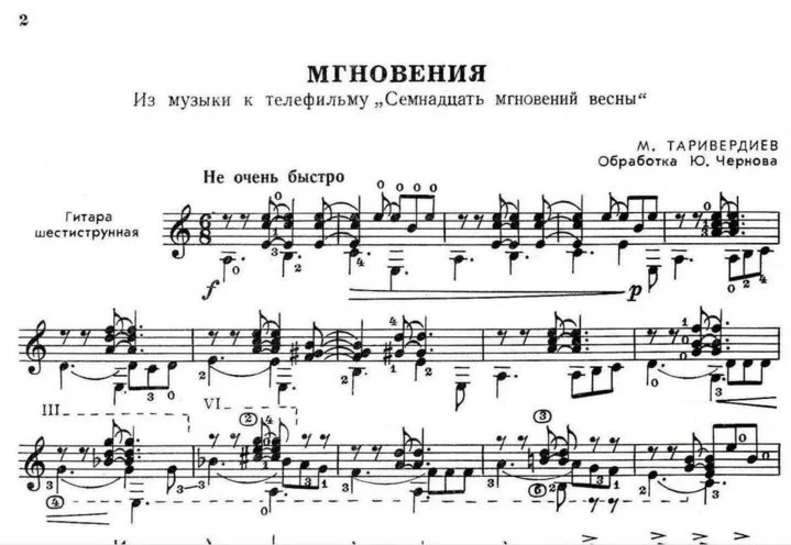 Знаменитая мелодия из к/ф "17 мгновений весны" теперь на гитаре! В архиве 2 переложения. Одно из них выполнено Ю.Черновым. Также прилагается звуковой MIDI файл. Качество нот очень хорошее.