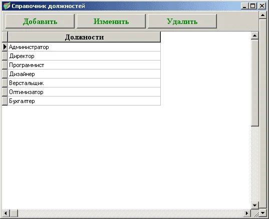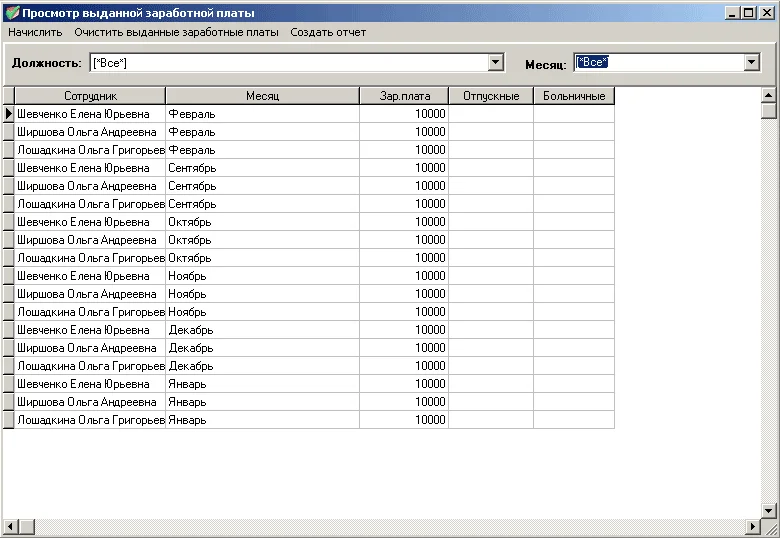 Программа позволяет вести учет сотрудников фирмы, выдавать заработную плату по месяцам, хранить информацию о должностях, создавать отчеты по сотрудникам с возможностью выбора нужной должности, а также создание отчетов по выданной заработной плате по всем месяцам или по какому-либо конкретному месяцу. При создании отчета по выданной заработной плате также можно выбрать необходимую должность.