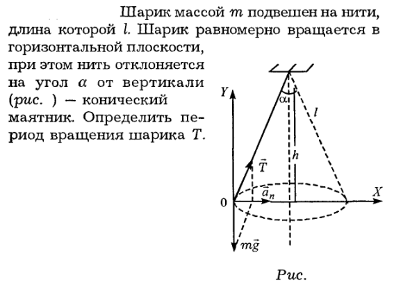 Шарик массой m подвешен на нити, длина которой I. Шарик равномерно вращается в горизонтальной плоскости, при этом нить отклоняется на угол а от вертикали (рис.) — конический маятник. Определить период вращения шарика Т.