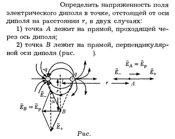 Определить напряженность поля электрического диполя в точке, отстоящей от оси диполя на расстоянии r, в двух случаях: 1) точка А лежит на прямой, проходящей через ось диполя; 2) точка В лежит на прямой, перпендикулярной оси диполя (рис. ).