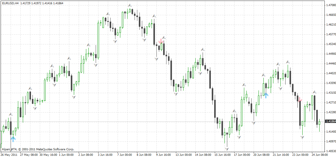 Сигналы на покупку/продажу возникают при их пересечении и выводятся ввиде стрелок - Вверх (Покупка) / Вниз (Продажа).