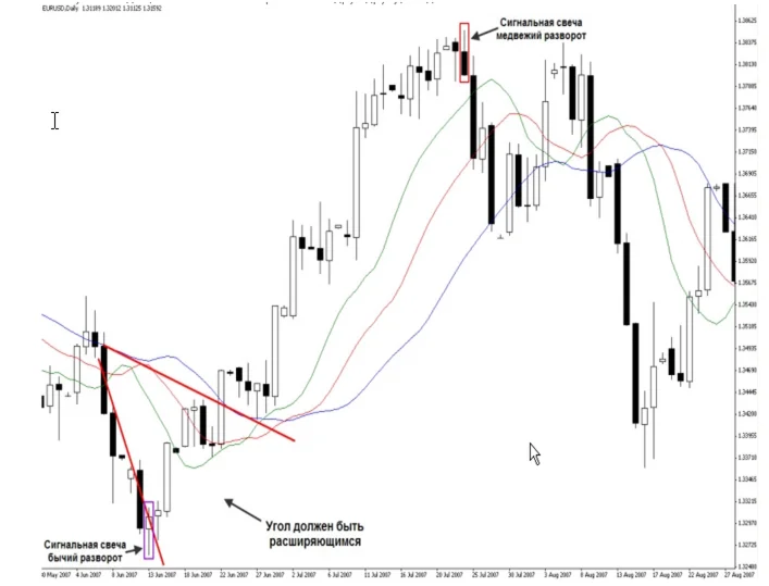 В стратегии используется дивергентный бар-убийца который нам укажет наиболее безопасную точку входа , а так же сигнал 2 пика поможет распознать дивергенцию на индикаторе АО , а при развороте тренда использовать сигналы 3-х мудрецов, а так же сигнал «специальный голубой свет» позволяющий выгоднее увеличить позицию, и сигналы всех пяти торговых измерений: