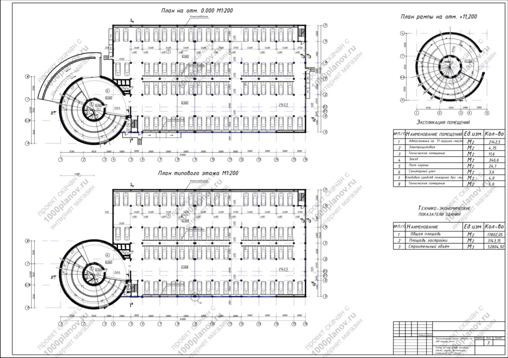 3. Планы на отм. 0,000, типового этажа, рампы; Экспликация помещений; ТЭП здания.