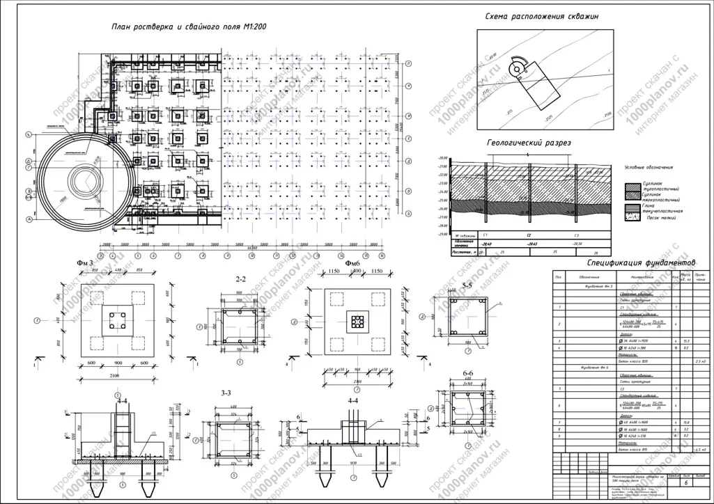6. Разрезы; План фундамента; Схема расположения горных выработок; Геологический разрез; Спецификация фундаментов