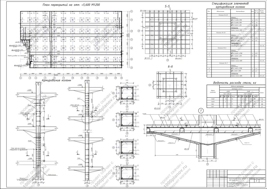 7. Планы перекрытий; Разрезы; Армирование колонн; Спецификация арматуры.