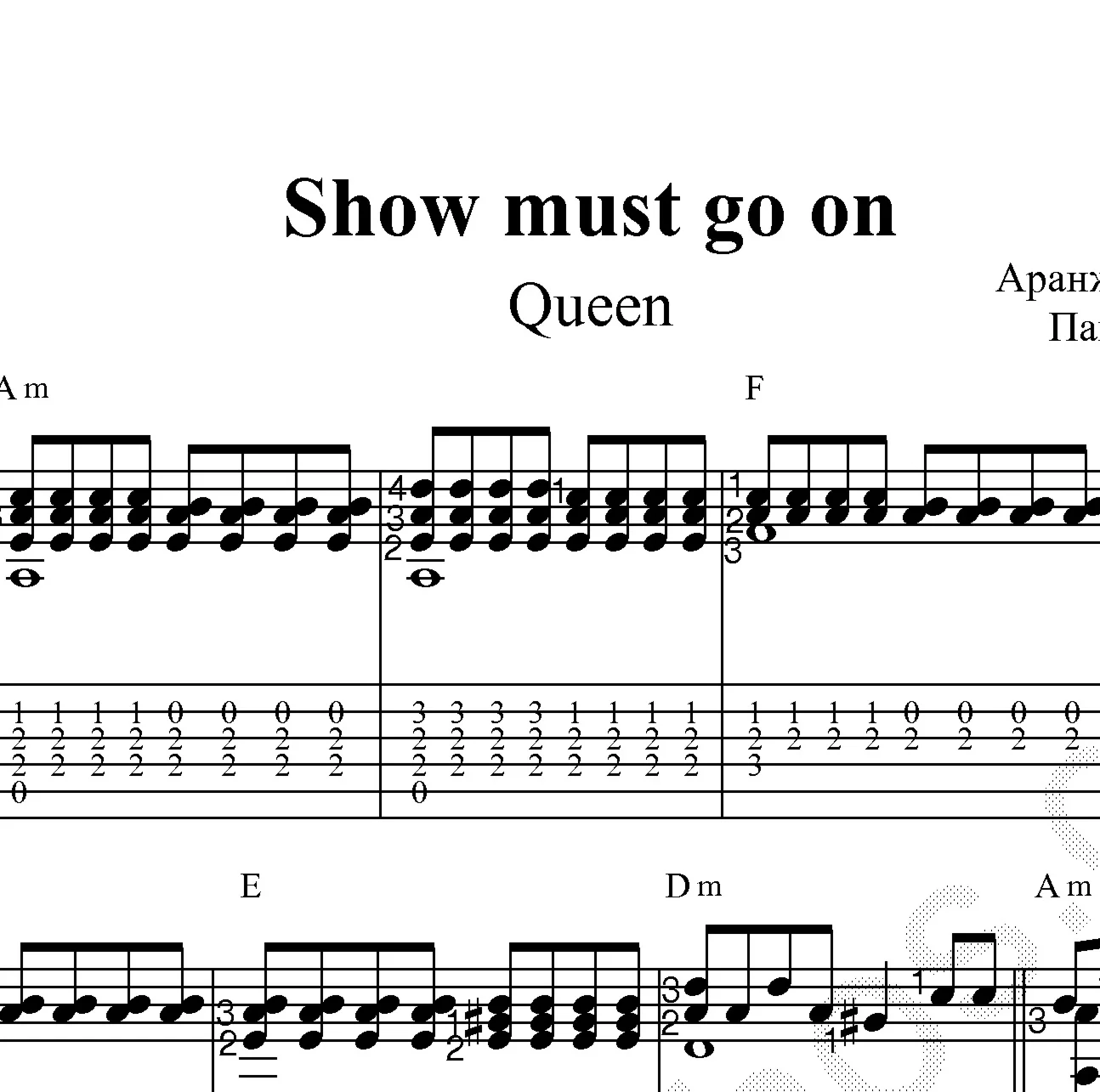 Ноты для одной гитары с аппликатурой левой руки продублированные табулатурой к переложению песни гр. Queen "Show must go on"