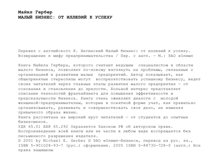 Перевел с английского К. Негинский Малый бизнес: от иллюзий к успеху. Возвращение к мифу предпринимательства / Пер. с англ.