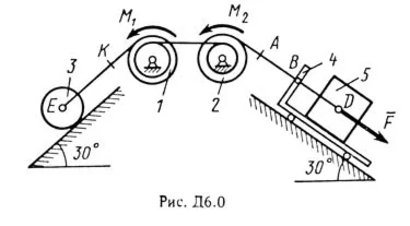 Решение задачи Д6 Вариант 02 по теормеху из методички Тарга С.М. 1988 года (Также совпадает с задачей Д8 Тарг 1983). Сверьте условие к задаче Д6 (стр. 56 в методичке Тарг С.М.): Механическая система состоит из тел 1, 2, 3, 4, 5, имеющих веса Р1, Р2, Р3, Р4, P5 соответственно; тела системы связаны нитями, намотанными на ступенчатые блоки 1 и 2 (рис. Д6.0-Д6.9, табл. Д6). Прочерк в столбцах таблицы, где заданы веса, означает, что соответствующее тело в систему не входит (на чертеже не изображать), а ноль в столбцах таблицы означает, что тело считается невесомым, но в систему входит (на чертеже должно быть изображено). Для колес, обозначенных номером 4, Р4 - их общий вес (вес платформы такой тележки не учитывается). Радиусы ступенчатых блоков 1 и 2 равны соответственно: R1=R, r1 = 0,8R; R2 = R, r2 = 0,4 R. При вычислении моментов инерции оба блока, колеса и катки считать однородными цилиндрами радиуса R. На систему кроме сил тяжести действуют сила F. приложенная к телу 4 или 5 (если тело 5 в систему не входит, сила приложена в точке В к тележке), и пары сил с моментами М1 и М2, приложенные к блокам (при М < 0 направление момента противоположно показанному на рисунке). На участке нити, указанном в таблице в столбце "Пружина", включена пружина с коэффициентом жесткости с (например, если в столбце стоит АВ, то участок АВ является пружиной, если AD то AD пружина, и т.д.) ; в начальный момент времени пружина не деформирована. Составить для системы уравнения Лагранжа и определить из них частоту и период колебаний, совершаемых телами системы при ее движении.