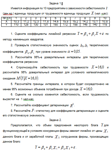 Имеется информация по 10 предприятиям о зависимости себестоимости (ден.ед.) единицы продукции от трудоемкости единицы продукции (чел -час):