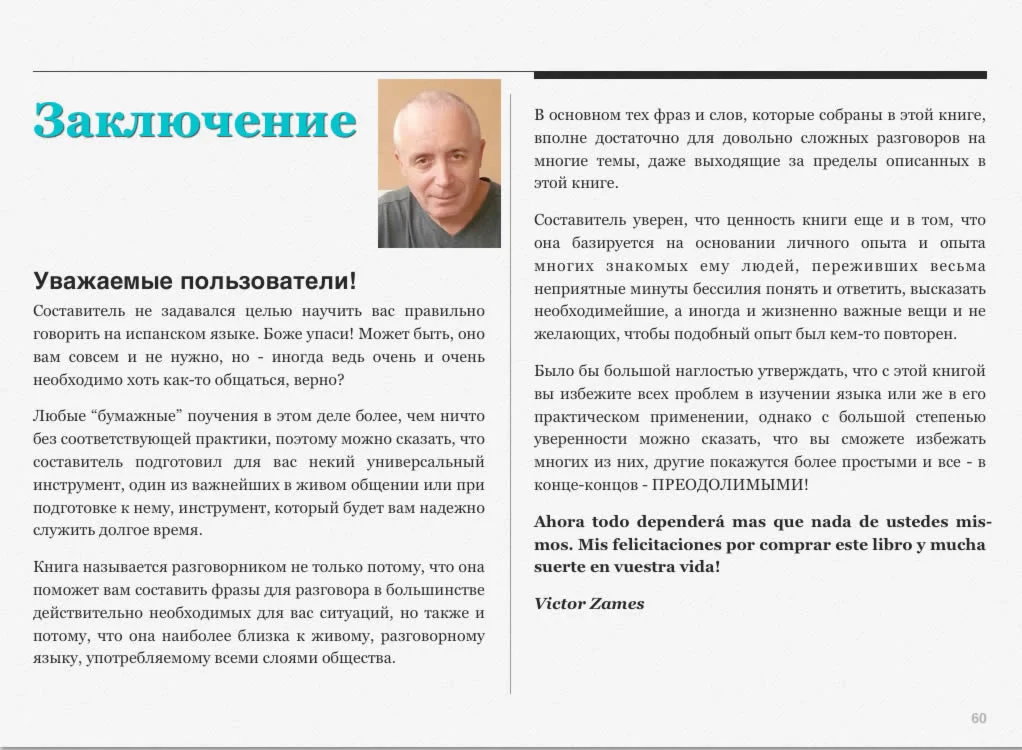 Этот разговорник - универсальный инструмент для всех, кому по делам или на отдыхе придется общаться на испанском языке. Книга составлена на основании опыта общения и предназначена для живого нормального общения, а также как дополнительное средство для изучающих испанский язык.