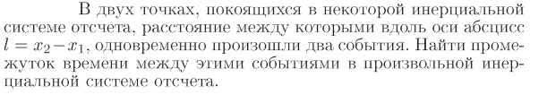 В двух точках, покоящихся в некоторой инерциальной системе отсчета, расстояние между которыми вдоль оси абсцисс l=x2-x1, одновременно произошли два события. Найти промежуток времени между этими событиями в произвольной инерциальной системе отсчета.