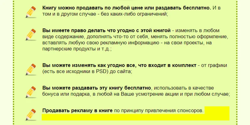 2. Вы имеете право делать что угодно с этой книгой - изменять в любом виде содержание, дополнять что-то от себя, менять полностью оформление, вставлять любую свою рекламную информацию - на свои проекты, на партнерские продукты и т.д.;