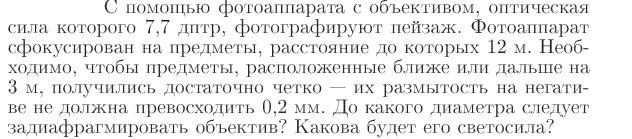 С помощью фотоаппарата с объективом, оптическая сила которого 7,7 дптр, фотографируют пейзаж. Фотоаппарат сфокусирован на предметы, расстояние до которых 12 м. Необходимо, чтобы предметы, расположенные ближе или дальше на 3 м, получились достаточно четко — их размытость на негативе не должна превосходить 0,2 мм. До какого диаметра следует задиафрагмировать объектив? Какова будет его светосила?