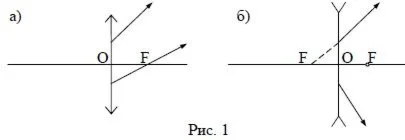 11. Найти построением положение святящейся точки, если известен ход лучей после их преломления в линзе. Один из этих лучей пересекается с главной оптической осью собирающей линзы в ее фокусе (рис. 1(а)). В случае с рассеивающей линзой (рис. 1(б)) один из лучей после преломления в линзе идет так, что его продолжение пересекается с главной оптической осью линзы в ее фокусе.