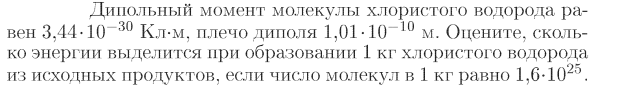 Дипольный момент молекулы хлористого водорода равен 3,44·10-30 Кл·м, плечо диполя 1,01·10-10 м. Оцените, сколько энергии выделится при образовании 1 кг хлористого водорода из исходных продуктов, если число молекул в 1 кг равно 1,6·1025.