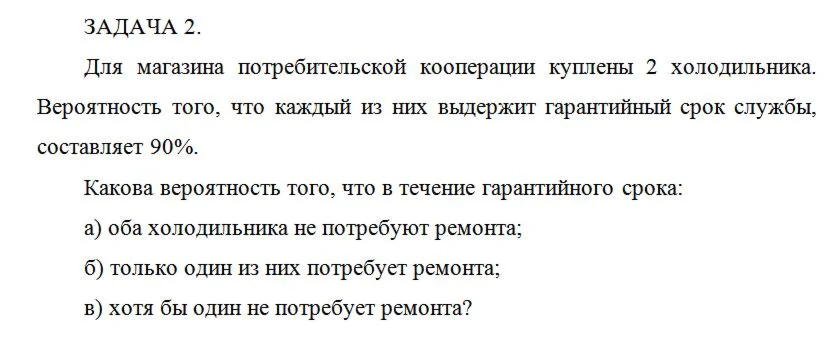 Для магазина потребительской кооперации куплены 2 холодильника. Вероятность того, что каждый из них выдержит гарантийный срок службы, составляет 90%.