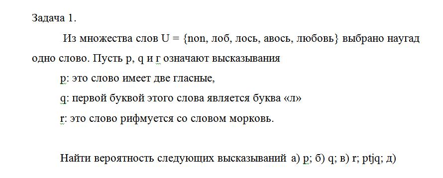 Из множества слов U = {non, лоб, лось, авось, любовь} выбрано наугад одно слово. Пусть p, q и г означают высказывания