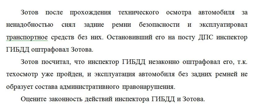 Зотов после прохождения технического осмотра автомобиля за ненадобностью снял задние ремни безопасности и эксплуатировал транспортное средств без них. Остановивший его на посту ДПС инспектор ГИБДД оштрафовал Зотова.
