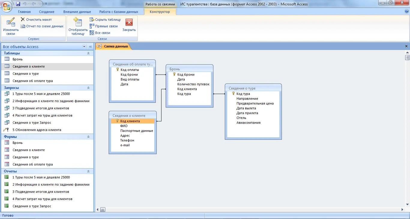 а. Бронь(Код брони, Дата, Количество путевок, Код клиента, Код тура)
