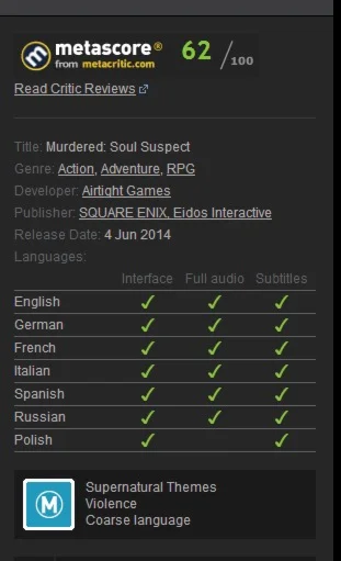 Murdered: Soul Suspect is a supernatural detective thriller which challenges players to solve possibly the hardest case of all… their own murder.