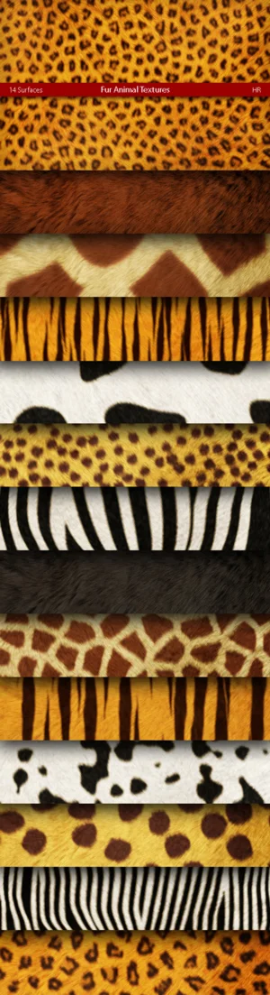 14 fur animal texture backgrounds. Fur Animal styles: Bear, Cheetah, Dalmatin, Girafe, Leopard, Tiger, Zebra. Great for your creativity, for website, 3D programs, banners, billboards, presentations, business cards, postcards, leaflets, flyers, flash and web backgrounds, desktop backgrounds and more.