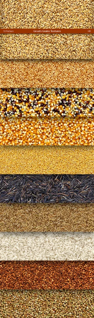 10 different Groats Grains surfaces realistic texture backgrounds: Wheat, Quinoa, Popcorn, Popcorn Mix, Millet, Wild Rice, Brown Rice, Whit Rice, Buckwheat, Buckwheat Green. Groats Grains Styles.