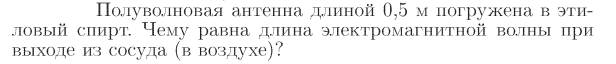 Полуволновая антенна длиной 0,5 м погружена в этиловый спирт. Чему равна длина электромагнитной волны при выходе из сосуда (в воздухе)?