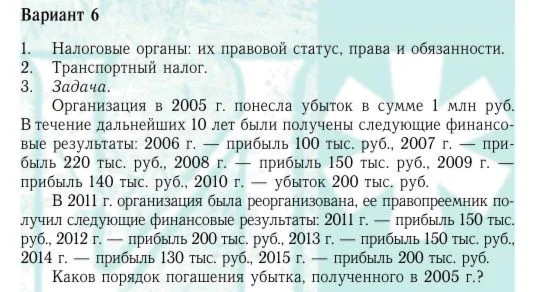 Организация в 2005 г. понесла убыток в сумме 1 млн. руб. В течение дальнейших 10 лет были получены следующие финансовые результаты: 2006 г. – прибыль 100 тыс. руб., 2007 г. – прибыль 220 тыс. руб., 2008 г. – прибыль – 150 тыс. руб., 2009 г. – прибыль 140 тыс. руб., 2010 г. – убыток 200 тыс. руб.