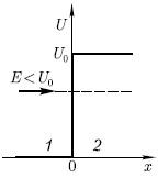 30. Частица массой m энергией Е движется в положительном направлении оси х и встречает на своем пути бесконечно протяженный прямоугольный потенциальный порог высотой U0. Энергия частицы Е < U0 (см. рисунок). Определите плотность вероятности обнаружения частицы на расстоянии х от потенциального порога, принимая, что ψ –функция нормирована так, что A1 = 1.