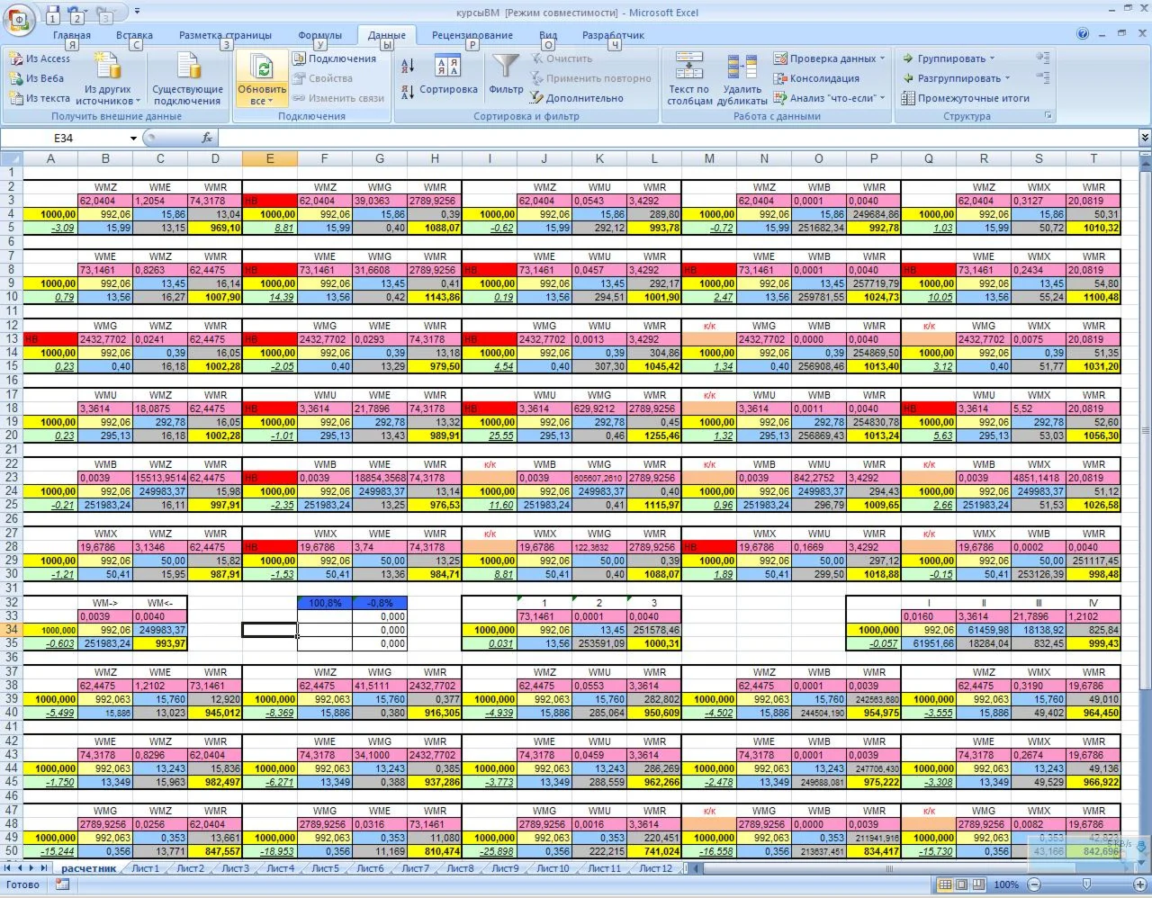 Это вариант WM-карусели в виде отдельного файла в формате Excel. Чтобы обновить данные нужно воспользоваться меню Данные-Обновить все, как на картинке. Сокращения в таблице НВ - низкая волатильность, торговать по этому направлению не рекомендуется. к/к - кросскурсы данные направления так же не следует торговать, поскольку по некоторым парам прямых возможностей обмена нет и они рассчитывались через WMZ без учета комиссии 0,8%. Оставлены чисто для справки. Желтые клетки - входящая исходящая суммы, зеленая клетка - процент получаемой выгоды. Остальные клетки вспомогательные либо с курсами обмена, либо с промежуточными рассчитанными результатами торговли. Успехов на бирже.