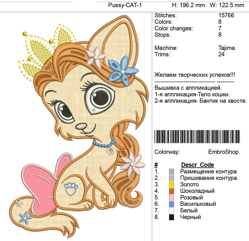 Магазин » Дизайн детской вышивки "Кошечка-1" с аппликацией.
