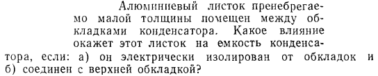 Алюминиевый листок пренебрегаемо малой толщины помещен между обкладками конденсатора. Какое влияние окажет этот листок на емкость конденсатора, если: а) он электрически изолирован от обкладок и б) соединен с верхней обкладкой?