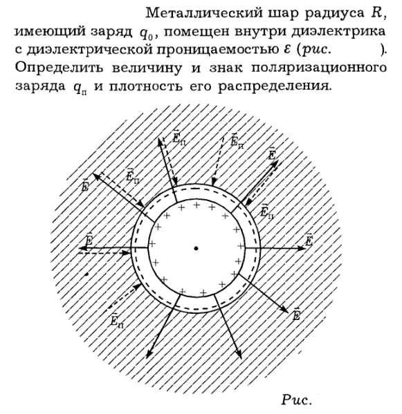 Металлический шар радиуса R, имеющий заряд q0, помещен внутри диэлектрика с диэлектрической проницаемостью e (рис. ). Определить величину и знак поляризационного заряда qп и плотность его распределения.