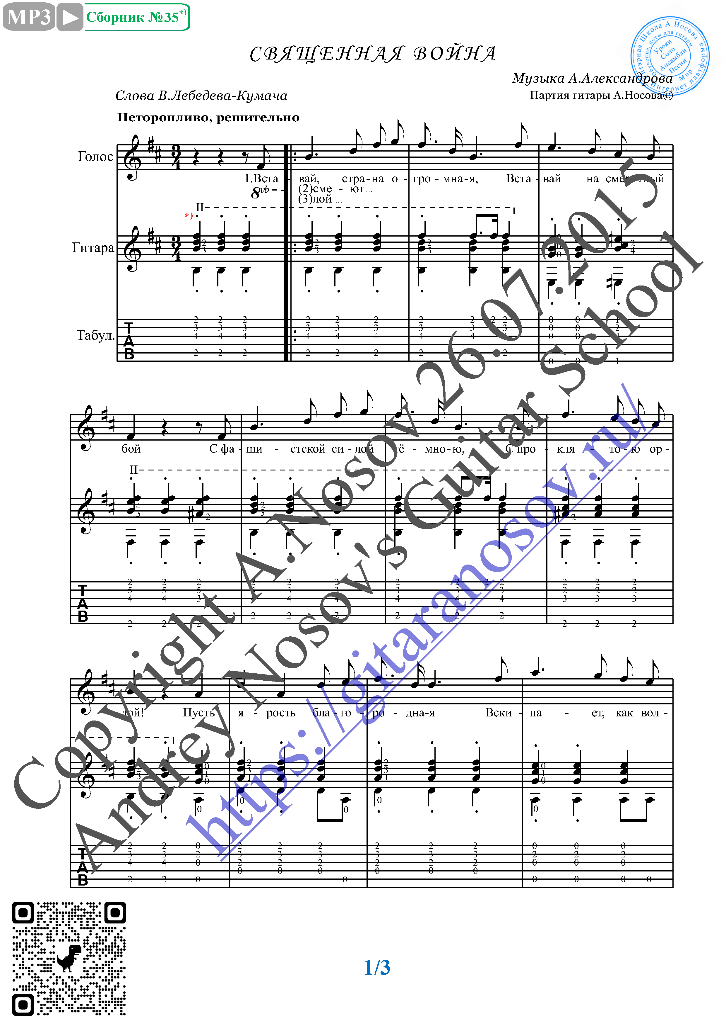 Вашему вниманию предлагается композиция "Священная война (муз.А.Александрова, сл.В.Лебедева-Кумача)", предназначенная для вокала в сопровождении 6-ти струнной гитары (pdf / png*). Запись выполнена нотами и включает в себя партию вокала с подтекстовкой, партию гитары с подробнейшей аппликатурой, текст песни (НА РУССКОМ ЯЗЫКЕ). Партия гитары продублирована табулатурой. Прилагается ссылка на скачивание mp3. *По просьбе покупателя.