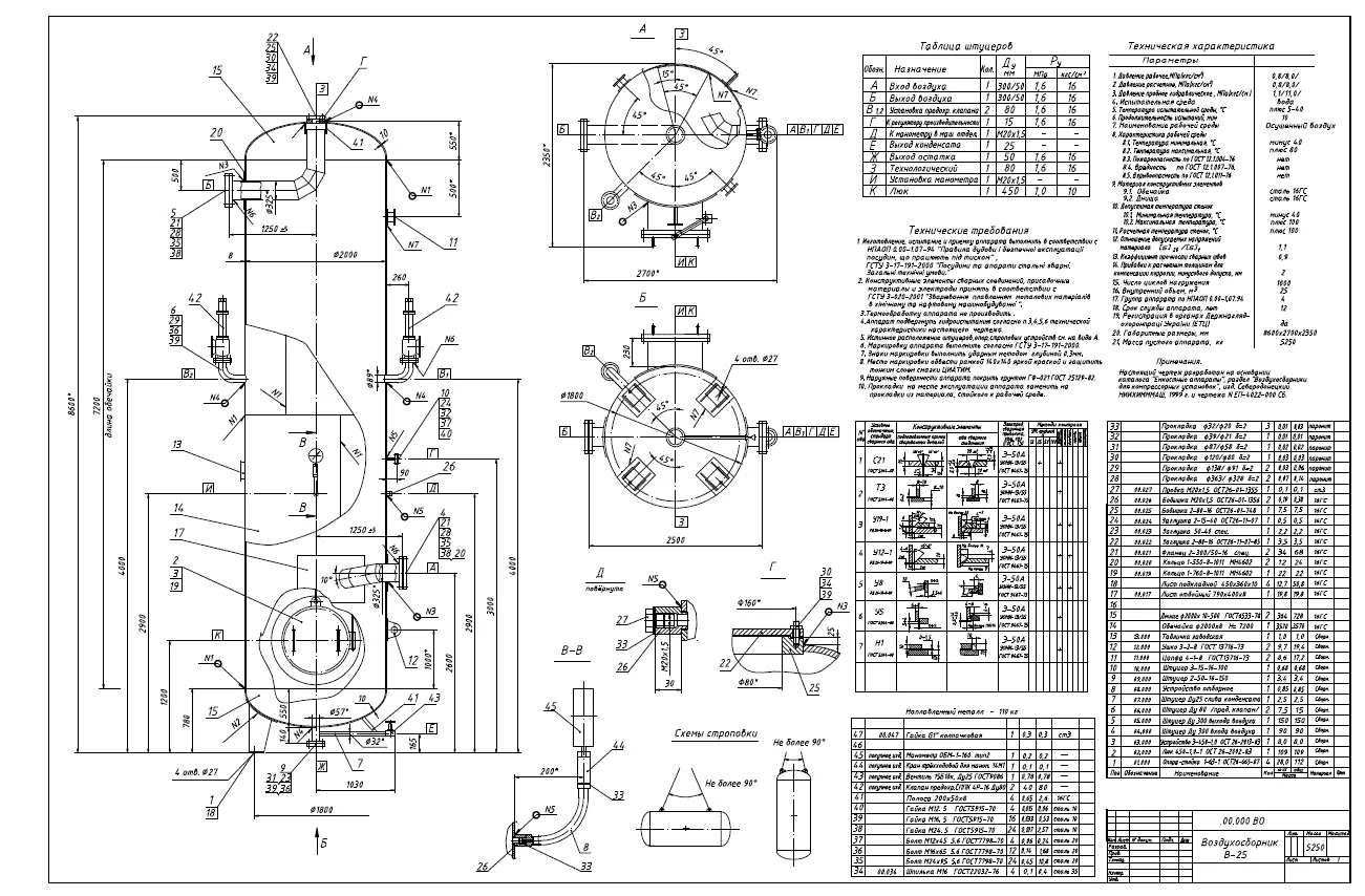 Чертеж воздухосборника V=25 м.куб Р=0.8 МПа (формат DWG). В коплекте чертеж общего вида, чертежи сборочных единиц, чертежи деталей, расчет на прочность.