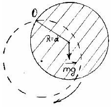 77. Сплошной однородный диск колеблется около оси, перпендикулярной к плоскости диска и проходящей через край диска (рис.). Найти радиус диска, если приведенная длина этого физического маятника равна L = 0,15 м.