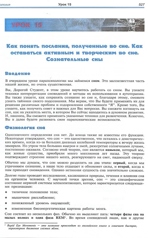 В очередном уроке парапсихологии мы займемся сном. Это малоизвестная часть нашей жизни, но очень сушественная. Вы в этом уроке научитесь работать со сном. Вы узнаете техники интерпретации сновидений и методы их использования в аутотерапии. Вы также узнаете, как сохранять сознание во сне и, благодаря этому, сможете узнать тайники своего подсознания.