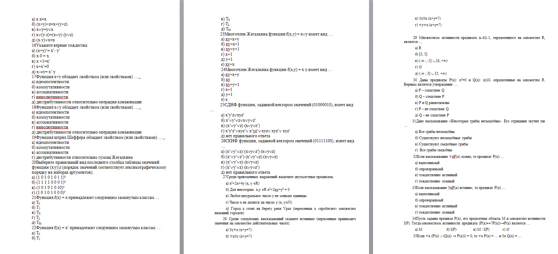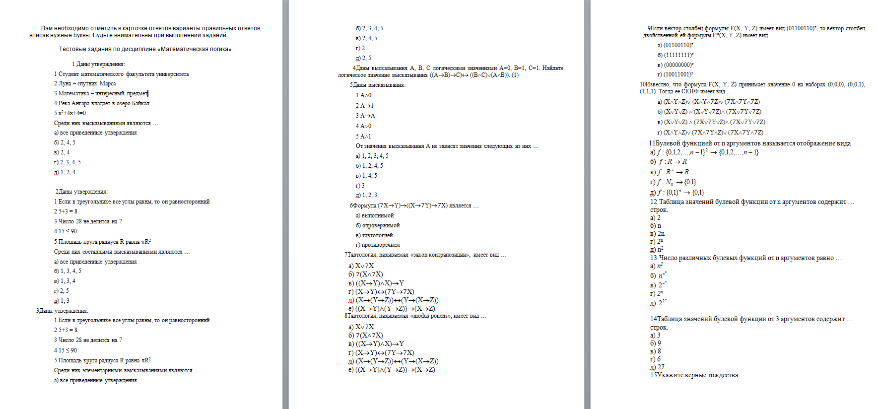 Тестовые задания по дисциплине «Математическая логика»