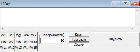 Программа L2Say рассылает сообщения в шаут, трейд, общий чаты. Не работает на серверах с защитой SmartGuard. Есть возможность добавлять мусор в сообщения чтобы система спам-фильтра не блокировала чат. Поддерживает до 15 окон одновременно, работает со свернутыми окнами (вы можете запустить программу и заниматься своими делами на компьютере). В архиве присутствует программа и полная инструкция.