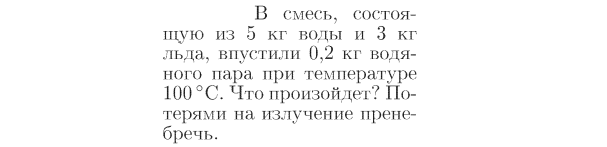 В смесь, состоящую из 5 кг воды и 3 кг льда, впустили 0,2 кг водяного пара при температуре 100 °С. Что произойдет? Потерями на излучение пренебречь.