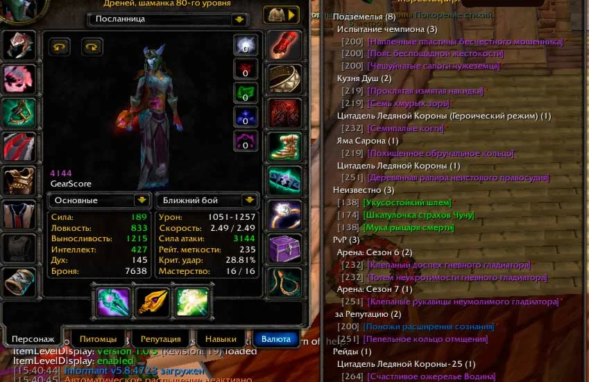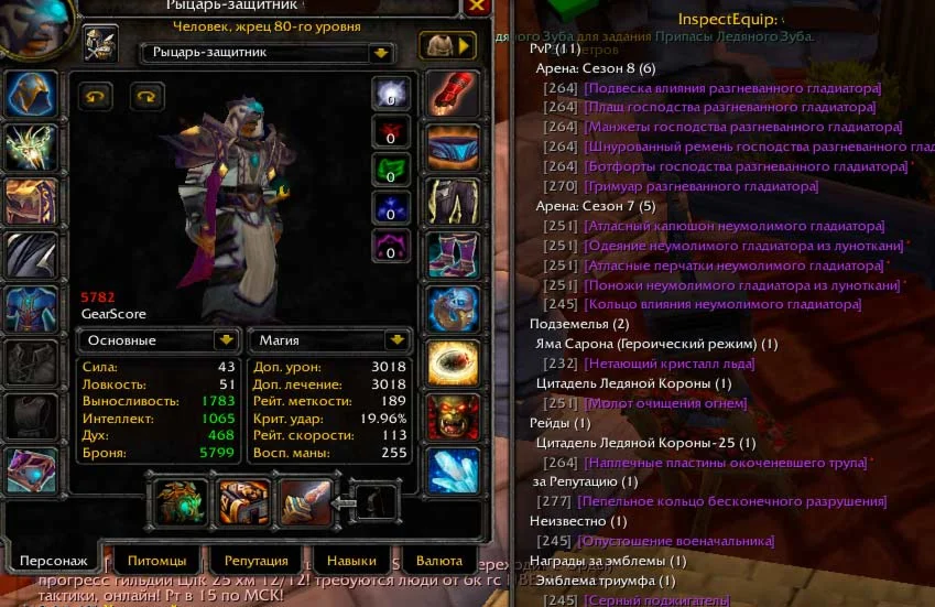 Ночной эльф друид. ПВЕ 4454гс. Профы: Кожевничество 96 и снятие шкур 106.