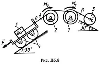 На систему кроме сил тяжести действуют сила F. приложенная к телу 4 или 5 (если тело 5 в систему не входит, сила приложена в точке В к тележке), и пары сил с моментами М1 и М2, приложенные к блокам (при М < 0 направление момента противоположно показанному на рисунке). На участке нити, указанном в таблице в столбце Пружина;, включена пружина с коэффициентом жесткости с (например, если в столбце стоит АВ, то участок АВ является пружиной, если AD то AD пружина, и т.д.); в начальный момент времени пружина не деформирована. Составить для системы уравнения Лагранжа и определить из них частоту и период колебаний, совершаемых телами системы при ее движении.