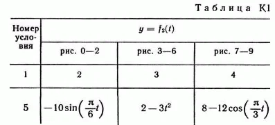 Зависимость x = f1(t) указана непосредственно на рисунках, а зависимость y = f2 дана в табл. K1 (для рис. 0—2 в столбце 2, для рис. 3—6 в столбце 3, для рис. 7—9 в стол