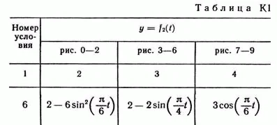 Зависимость x = f1(t) указана непосредственно на рисунках, а зависимость y = f2 дана в табл. K1 (для рис. 0—2 в столбце 2, для рис. 3—6 в столбце 3, для рис. 7—9 в столбце 4)."