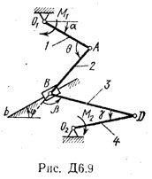 На механизм действуют: на рис. 0—2 — сила F, приложенная к ползуну D, и пара сил с моментом М, приложенная к стержню 1; на рис. 3—9 — пары сил с моментами М1 и М2, приложенные к стержням 1 и 4.