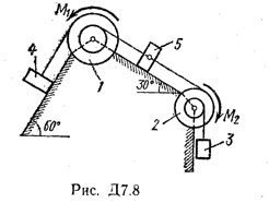 Механическая система состоит из шкивов 1 и 2, обмотанных нитями, и грузов 3—5, прикрепленных к этим нитям (рис. Д7.0 — Д7.9, табл. Д7). Система движется в вертикальной плоскости под действием сил тяжести и двух пар сил с моментом М1, приложенной к шкиву 1, и пары с моментом М2, приложенной к шкиву 2. Радиусы ступеней шкива 1 равны: R1 = 0,3 м, r1 — 0,15 м, а шкива 2 — R2 = 0,2 м, r2 = 0,1 м; их радиусы инерции относительно осей вращения равны соответственно ρ1 = 0,2 м и ρ2 = 0,1 м.