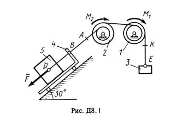 На систему кроме сил тяжести действуют сила F. приложенная к телу 4 или 5 (если тело 5 в систему не входит, сила приложена в точке В к тележке), и пары сил с моментами М1 и М2, приложенные к блокам (при М < 0 направление момента противоположно показанному на рисунке).