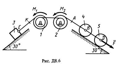 На систему кроме сил тяжести действуют сила F. приложенная к телу 4 или 5 (если тело 5 в систему не входит, сила приложена в точке В к тележке), и пары сил с моментами М1 и М2, приложенные к блокам (при М < 0 направление момента противоположно показанному на рисунке).