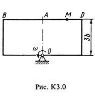 Прямоугольная пластина (рис. К3.0-К3.5) или круглая пластина радиусом R = 60 см (рис. К3.6-К3.9) вращается вокруг неподвижной оси с постоянной угловой скоростью ω, заданной в табл. К3 (при знаке минус направление ω противоположно показанному на рисунке). Ось вращения на рис. К3.0-К3.3 и К3.8, К3.9 перпендикулярна плоскости пластины и проходит через точку О (пластина вращается в своей плоскости); на рис. К3.4-К3.7 ось вращения ОО1 лежит в плоскости пластины (пластина вращается в пространстве).